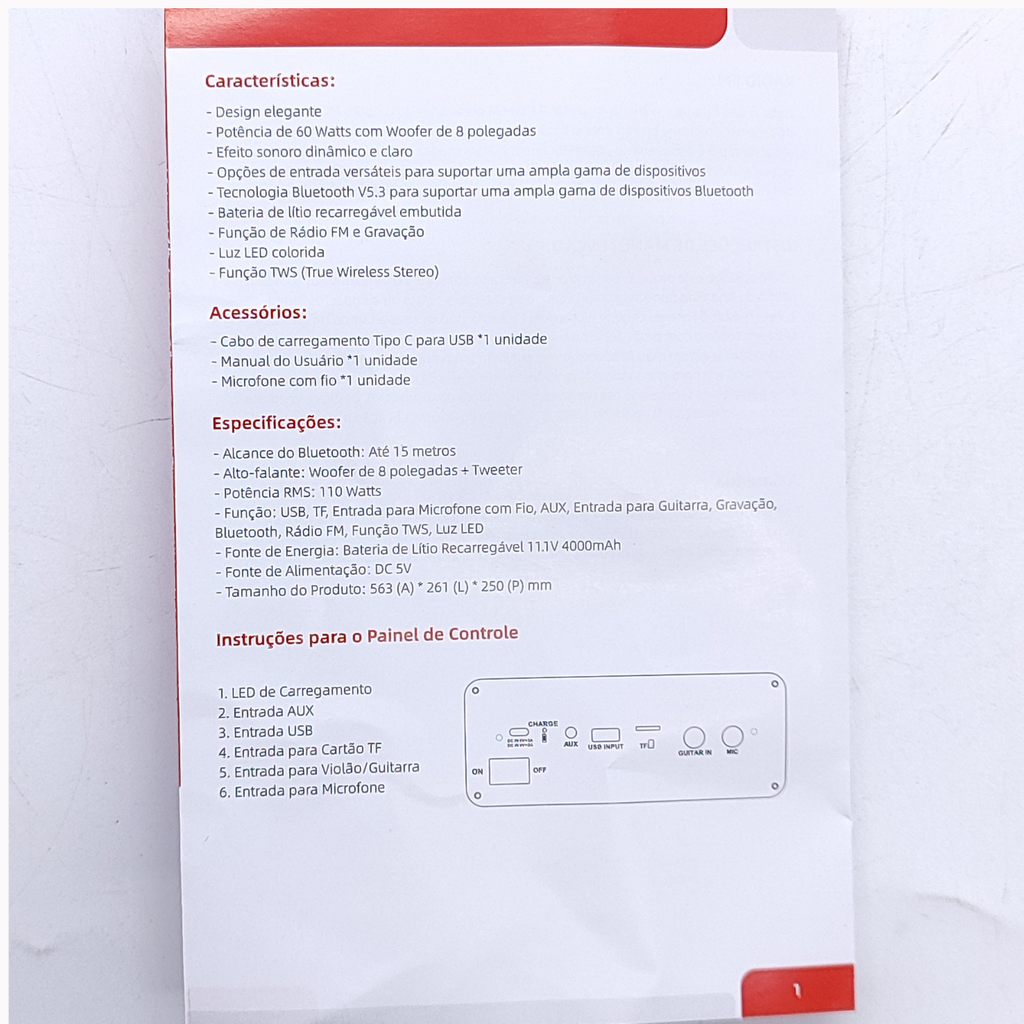 Caixa de Som Bluetooth 5.3 com LED 110W RMS 4000mAh Compatível Entradas, USB, AUX, Microfone e Guitarra
